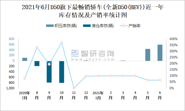2021年6月D50旗下最暢銷車(全新D50(BEV))近一年庫存情況及產銷率統計圖
