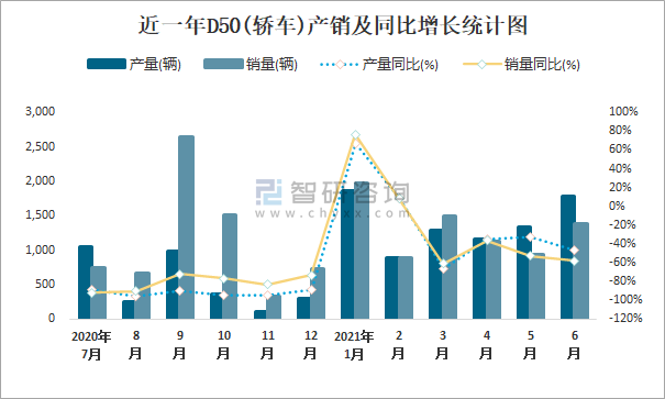 近一年D50(轎車)產銷及同比增長統計圖