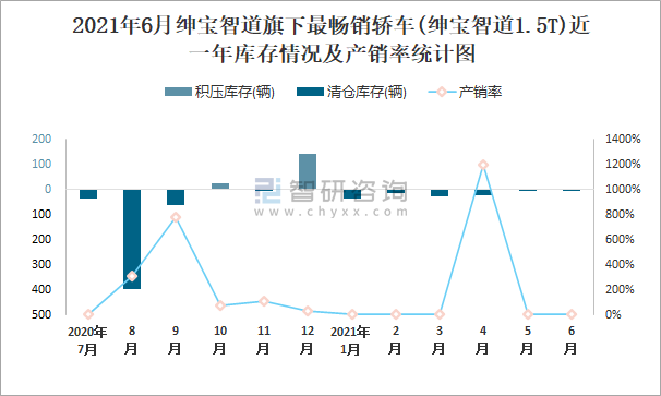2021年6月紳寶智道旗下最暢銷車(紳寶智道1.5T)近一年庫存情況及產(chǎn)銷率統(tǒng)計圖
