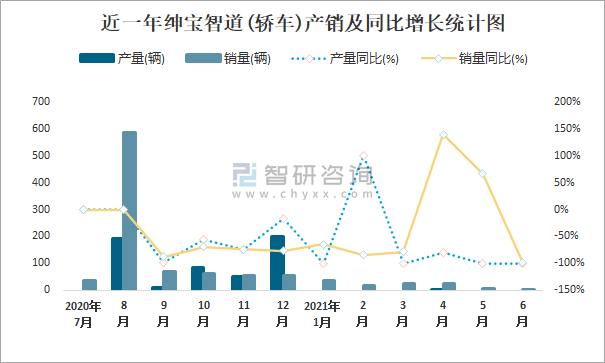 根據(jù)中國汽車工業(yè)協(xié)會數(shù)據(jù)可知:2021年6月紳寶智道(轎車)產(chǎn)量為0輛,同比下降100%,銷量為1輛,同比下降99%,當(dāng)月產(chǎn)銷率為0;2021年上半年紳寶智道(轎車)產(chǎn)量為2輛,同比下降99.5%,銷量為107輛,同比下降75.4%,產(chǎn)銷率為5350%;2018-2020年紳寶智道(轎車)產(chǎn)銷量均在2019年達到最高值,次年大幅度下降,且近3年總銷量大于總產(chǎn)量,清倉庫存1673輛。