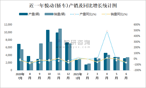 近一年悅動(轎車)產銷及同比增長統計圖