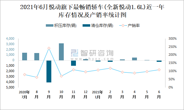 2021年6月悅動旗下最暢銷車(全新悅動1.6L)近一年庫存情況及產銷率統計圖