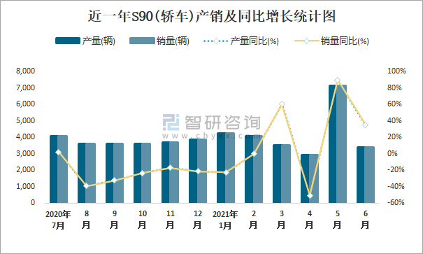 2021年上半年S90(轎車(chē))產(chǎn)銷(xiāo)量分別為25302輛和25302輛 產(chǎn)銷(xiāo)率為100%