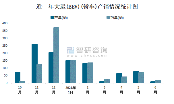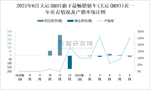 根據中國汽車工業協會數據可知:2021年6月大運(BEV)(轎車)產量為8輛,同比下降0%,銷量為20輛,同比下降0%,當月產銷率為250%;2021年上半年大運(BEV)(轎車)產量為439輛,同比下降0%,銷量為442輛,同比下降0%,產銷率為100.68%;且2020年大運(BEV)(轎車)總產量大于總銷量,積壓了庫存26輛。