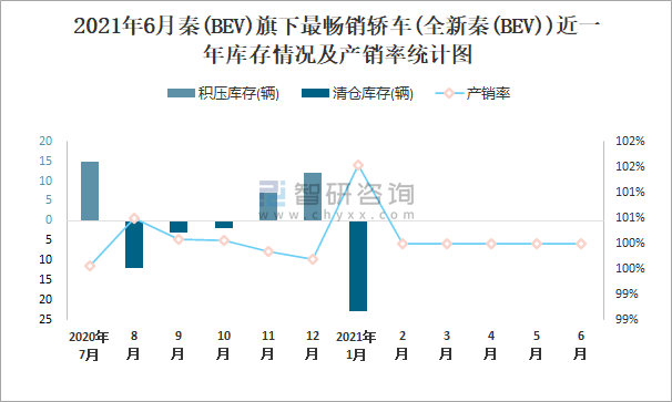 2021年6月秦(BEV)旗下最暢銷車(全新秦(BEV))近一年庫存情況及產銷率統計圖