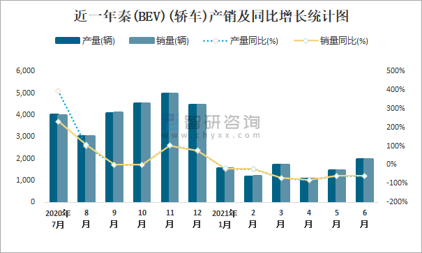 根據中國汽車工業協會數據可知:2021年6月秦(BEV)(轎車)產量為1968輛,同比下降59.7%,銷量為1968輛,同比下降59.7%,當月產銷率為100%;2021年上半年秦(BEV)(轎車)產量為8668輛,同比下降62.6%,銷量為8691輛,同比下降62.5%,產銷率為100.27%;2016-2020年秦(BEV)(轎車)產銷量均在2017年跌至最低值,此后逐年遞增,且近5年總產量大于總銷量,積壓了庫存57輛。