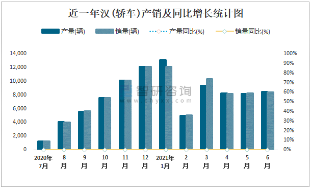 根據(jù)中國(guó)汽車工業(yè)協(xié)會(huì)數(shù)據(jù)可知:2021年6月漢(轎車)產(chǎn)量為8459輛,同比下降0%,銷量為8386輛,同比下降0%,當(dāng)月產(chǎn)銷率為99.14%;2021年上半年漢(轎車)產(chǎn)量為52325輛,同比下降0%,銷量為52231輛,同比下降0%,產(chǎn)銷率為99.82%;且2020年漢(轎車)總產(chǎn)量大于總銷量,積壓了庫(kù)存14輛。