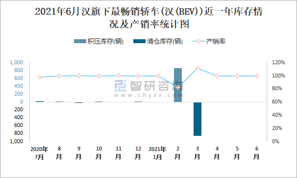 2021年6月漢旗下最暢銷車(漢(BEV))近一年庫(kù)存情況及產(chǎn)銷率統(tǒng)計(jì)圖