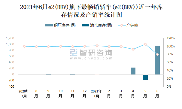 2021年6月E2(BEV)旗下最暢銷車(e2(BEV))近一年庫存情況及產銷率統計圖