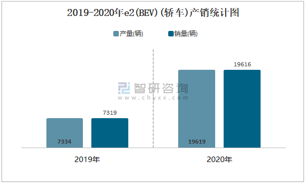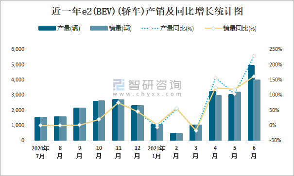 根據中國汽車工業協會數據可知:2021年6月e2(BEV)(轎車)產量為4935輛,同比增長228.8%,銷量為3972輛,同比增長161.8%,當月產銷率為80.49%;2021年上半年e2(BEV)(轎車)產量為13682輛,同比增長100%,銷量為12685輛,同比增長85.2%,產銷率為92.71%;2019-2020年e2(BEV)(轎車)產銷量大幅度上升,且近2年總產量大于總銷量,積壓了庫存18輛。