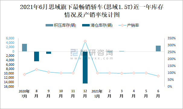 2021年6月思域旗下最暢銷車(思域1.5T)近一年庫(kù)存情況及產(chǎn)銷率統(tǒng)計(jì)圖