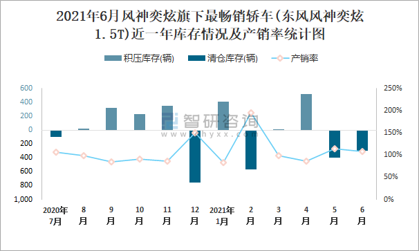 2021年6月風神奕炫旗下最暢銷車(東風風神奕炫1.5T)近一年庫存情況及產銷率統計圖