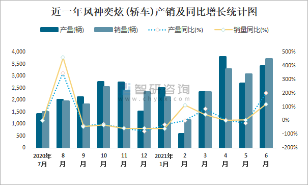 根據中國汽車工業協會數據可知:2021年6月風神奕炫(轎車)產量為3422輛,同比增長200.4%,銷量為3720輛,同比增長120.3%,當月產銷率為108.71%;2021年上半年風神奕炫(轎車)產量為15347輛,同比增長18%,銷量為15715輛,同比增長2.4%,產銷率為102.4%;2019-2020年風神奕炫(轎車)產銷量有所增加,且近2年總產量大于總銷量,積壓了庫存416輛。