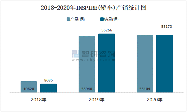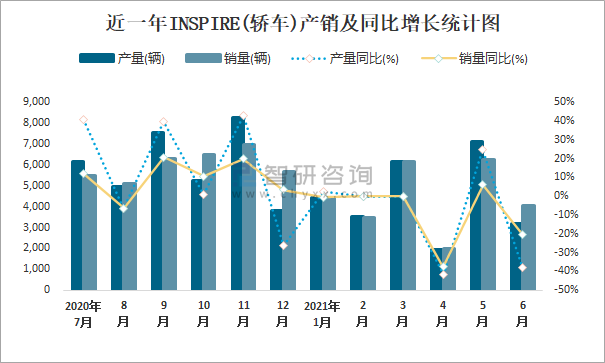 根據中國汽車工業協會數據可知:2021年6月INSPIRE(轎車)產量為3184輛,同比下降37.9%,銷量為4067輛,同比下降20.7%,當月產銷率為127.73%;2021年上半年INSPIRE(轎車)產量為26376輛,同比增長37.6%,銷量為26300輛,同比增長37.1%,產銷率為99.71%;2018-2020年INSPIRE(轎車)產銷量均在2019年達到最高值,此后有所下滑,且近3年總產量大于總銷量,積壓了庫存143輛。