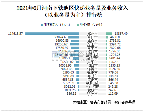 2021年6月河南下轄地區(qū)快遞業(yè)務(wù)量及業(yè)務(wù)收入(以業(yè)務(wù)量為主)排行榜