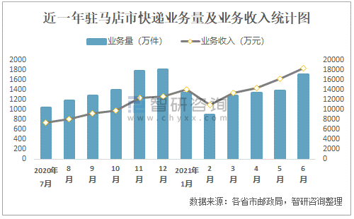 近一年駐馬店市快遞業(yè)務(wù)量及業(yè)務(wù)收入統(tǒng)計(jì)圖