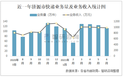 近一年濟(jì)源市快遞業(yè)務(wù)量及業(yè)務(wù)收入統(tǒng)計(jì)圖