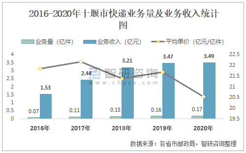 2016-2020年十堰市快遞業(yè)務量及業(yè)務收入統(tǒng)計圖