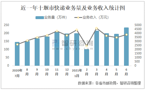 近一年十堰市快遞業(yè)務量及業(yè)務收入統(tǒng)計圖