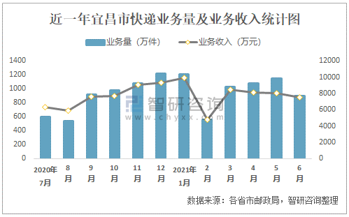 2021年6月宜昌市快遞業務量與業務收入分別為899.84萬件和7551.5萬元
