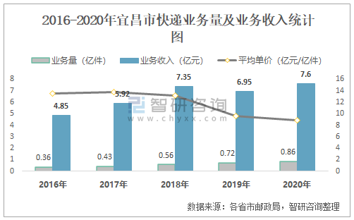 2016-2020年宜昌市快遞業務量及業務收入統計圖