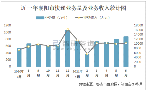 近一年襄陽市快遞業務量及業務收入統計圖
