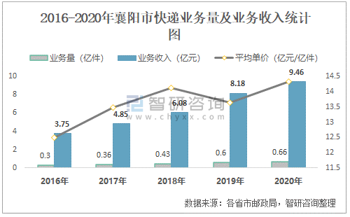 2016-2020年襄陽市快遞業務量及業務收入統計圖