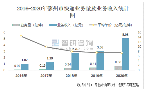 2016-2020年鄂州市快遞業務量及業務收入統計圖