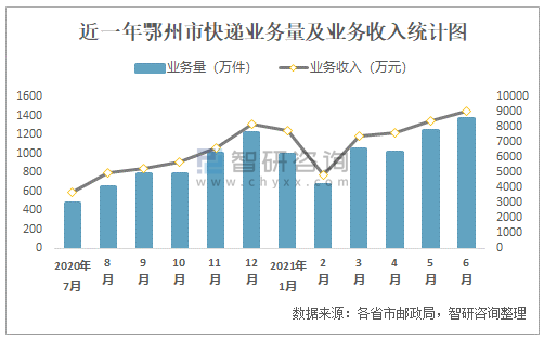 根據各省市郵政局數據可知:2021年6月鄂州市快遞業務量為1368.27萬件,業務收入為9049.82萬元;2021年1-6月鄂州市快遞累計業務量為6332.62萬件,同比增長242.1%,累計業務收入為44992.95萬元,同比增長175.58%;2016-2020年鄂州市快遞業務量與業務收入均逐年遞增,平均單價總體呈現下降趨勢。