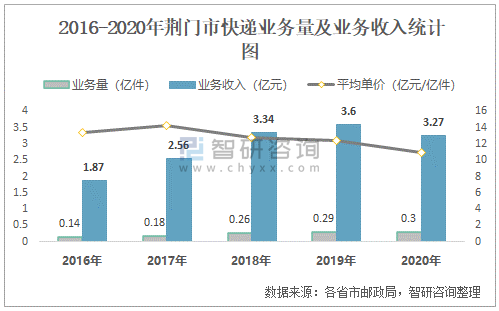 2016-2020年荊門市快遞業務量及業務收入統計圖