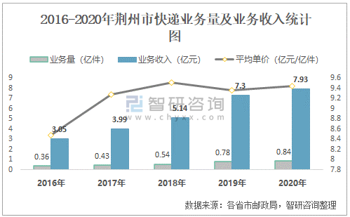2016-2020年荊州市快遞業務量及業務收入統計圖