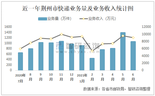 根據各省市郵政局數據可知:2021年6月荊州市快遞業務量為1056.33萬件,業務收入為9044.83萬元;2021年1-6月荊州市快遞累計業務量為5357.16萬件,同比增長85.86%,累計業務收入為48186.09萬元,同比增長65.57%;2016-2020年荊州市快遞業務量與業務收入均逐年遞增,平均單價總體呈現上升趨勢。