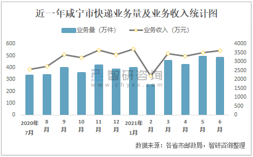 近一年咸寧市快遞業務量及業務收入統計圖
