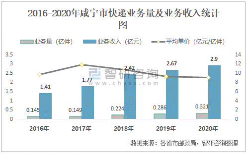 2016-2020年咸寧市快遞業務量及業務收入統計圖