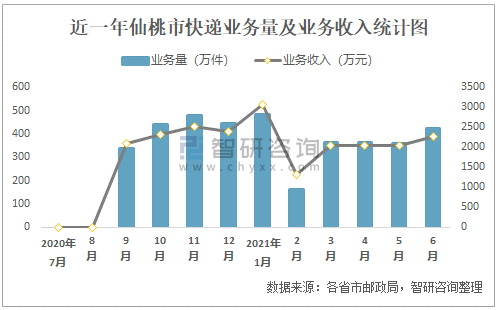 近一年仙桃市快遞業(yè)務(wù)量及業(yè)務(wù)收入統(tǒng)計(jì)圖