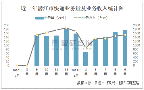 根據各省市郵政局數據可知:2021年6月潛江市快遞業務量為174.65萬件,業務收入為1533.85萬元;2021年1-6月潛江市快遞累計業務量為839.75萬件,同比增長149.83%,累計業務收入為8310.42萬元,同比增長71.91%;2016-2020年潛江市快遞業務量與業務收入均逐年遞增,平均單價存在一定幅度的波動。