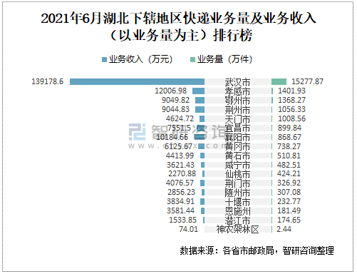 2021年6月湖北下轄地區快遞業務量及業務收入(以業務量為主)排行榜
