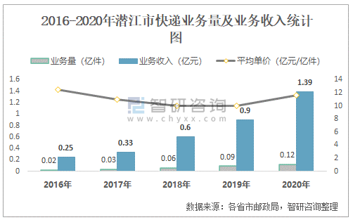 2016-2020年錢江市快遞業務量及業務收入統計圖