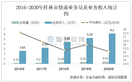 2016-2020年桂林市快遞業務量及業務收入統計圖