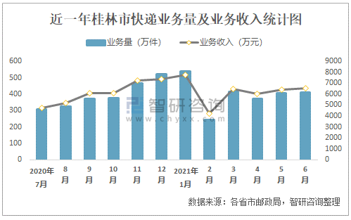 近一年桂林市快遞業務量及業務收入統計圖