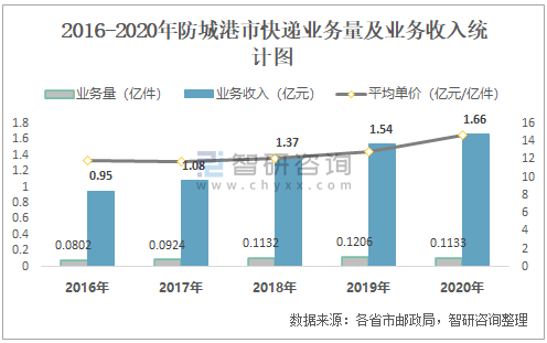 2016-2020年防城港市快遞業務量及業務收入統計圖