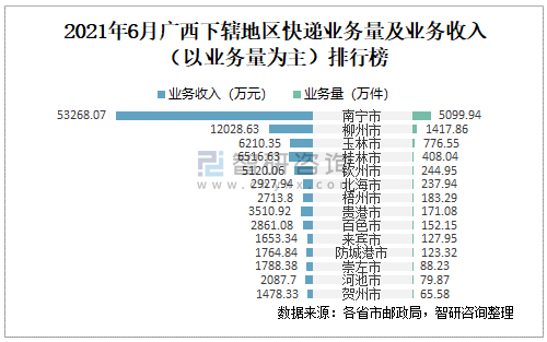 2021年6月廣西下轄地區快遞業務量及業務收入(以業務量為主)排行榜