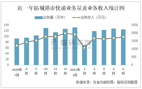 近一年防城港市快遞業務量及業務收入統計圖