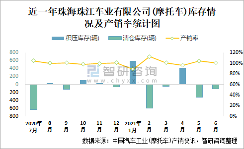 近一年珠海珠江車業(yè)有限公司庫存情況及產(chǎn)銷率統(tǒng)計圖