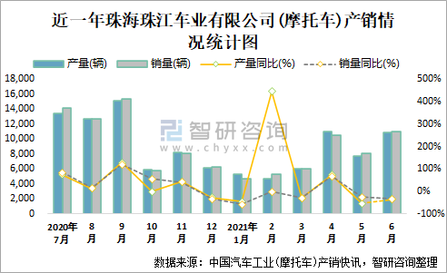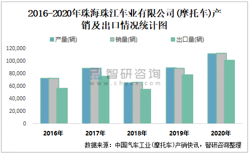 根據(jù)中國汽車工業(yè)(摩托車)產(chǎn)銷快訊數(shù)據(jù)顯示:2021年6月珠海珠江車業(yè)有限公司(摩托車)產(chǎn)量為10870輛,同比下降35.3%,銷量為10982輛,同比下降32.84%;2021年1-6月珠海珠江車業(yè)有限公司(摩托車)累計產(chǎn)量為45675輛,同比下降8.92%,累計銷量為45744輛,同比下降9.81%;2016-2020年珠海珠江車業(yè)有限公司(摩托車)產(chǎn)銷量總體呈現(xiàn)上升趨勢,且近5年總銷量大于總產(chǎn)量,清倉庫存822輛,總體銷量以出口為主。