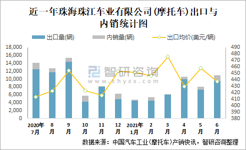 根據(jù)中國汽車工業(yè)(摩托車)產(chǎn)銷快訊數(shù)據(jù)統(tǒng)計可知:近一年珠海珠江車業(yè)有限公司(摩托車)共清倉庫存730輛,其產(chǎn)銷率存在一定幅度波動,2月產(chǎn)銷率最高(112.62%),清倉庫存598輛,1月產(chǎn)銷率偏低(88.89%),積壓庫存589輛;近一年珠海珠江車業(yè)有限公司(摩托車)總體銷量以出口為主,總出口量占比總銷量的90.2%,出口均價3月達到最高值,此后有所下滑,其中6月出口量為9521輛,出口均價約為436.89美元/輛;2021年1-6月珠海珠江車業(yè)有限公司(摩托車)累計出口量為41769輛,同比下降8.54%,累計出口金額約為1866.82萬美元,同比下降2.74%。