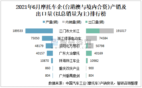 2021年6月摩托車企(臺港澳與境內(nèi)合資)產(chǎn)銷及出口量(以總銷量為主)排行榜