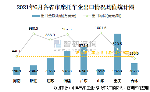 2021年6月各省市摩托車企出口情況均值統(tǒng)計圖