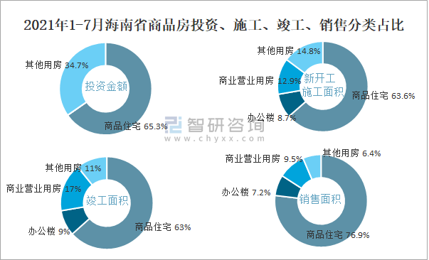 2021年1-7月海南省商品房投資、施工、竣工、銷售分類占比