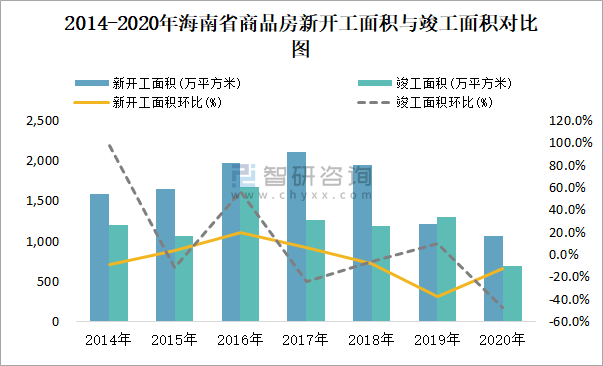 2014-2020年海南省商品房新開工面積與竣工面積對比圖